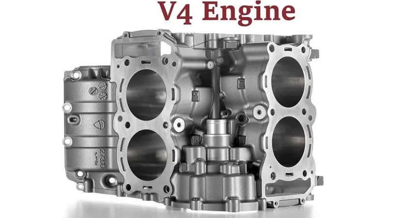 یک موتور V4 دارای دو مجموعه پیستون است که در جلو و پشت دیگری یا در طرف مقابل موتورسیکلت نصب شده است.