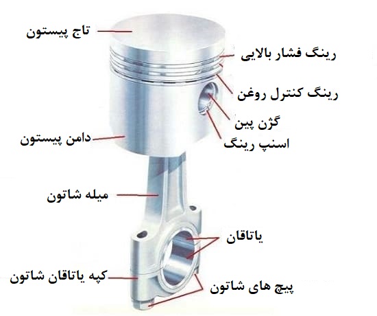 این قسمت از موتور احتراق داخلی دارای قسمت متحرک فلزی با رینگ پیستون می باشد. از یک گژن پین برای اتصال شاتون به پیستون استفاده می شود. این شاتون از طریق انگشتی میل لنگ به میل لنگ متصل می شود.