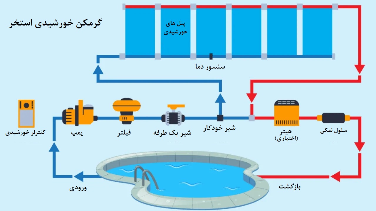 سیستم های گرمایش خورشیدی استخر به طور یکپارچه با تجهیزات استخر کار می کنند و کاملا اتوماتیک هستند. دمای آب مورد نظر روی کنترلر خورشیدی تنظیم می شود.